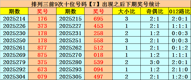 在十位前9次出现号码7后,其下期奖号分别开出:9-5-5-5-1-1-3-9-9,其中奖号个数大小比是6:3,012路比是4:2:3,奇偶比是9:0。