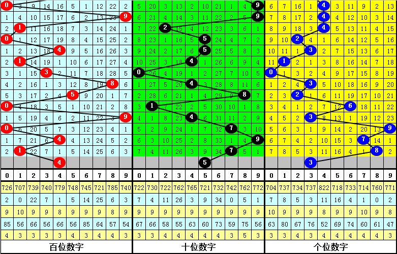 其中,号码0-9开出次数分别为:号码0开出4次、1开出2次、2开出2次、3开出3次、4开出6次、5开出3次、6开出1次、7开出1次、8开出4次、9开出4次。