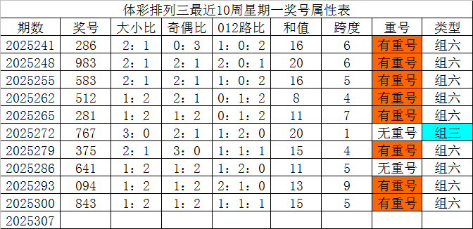 体彩排列三最近10周星期一奖号分别为:286、983、583、512、281、767、375、641、094、843,各奖号属性详见下表: