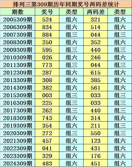 在排列三第309期历史同期开奖中,各号码两码差分别为:123、145、044、235、044、246、044、156、358、156、033、033、044、134、112、055、123、134、167、145;