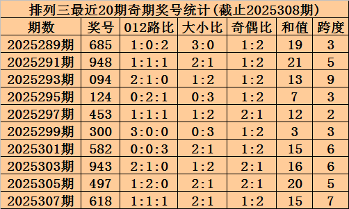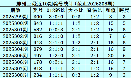 上期回顾:排列三2025308期奖号为234,奇偶比为1:2,大小比为0:3,跨度为9。