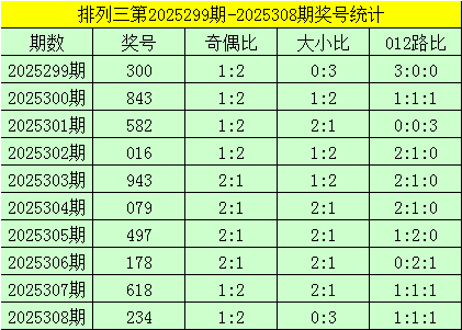 排列三最近十期分别开出奖号:234、618、178、497、079、943、016、582、843、300,其中号码奇偶比为14:16,奇偶号码出现比例相当;号码大小比为13:17,大小 号码开出个数相当;号码012路比为13:10:7,0路号码热出。