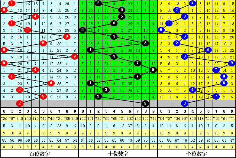 号码跨度:在第310期同期奖号中,跨度开出频次分别为:跨度5开出8期,跨度6开出4期,跨度3、4、7开出2期,跨度0、2开出1期,跨度1、8、9没有出现。去年同期开出7,本期看好跨度下降,一码跨度参考6。