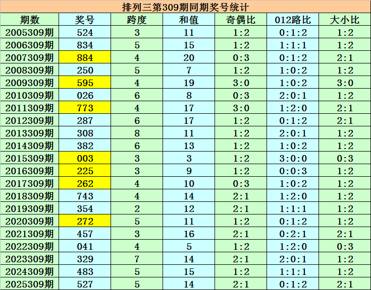 本期为排列三第2025310期开奖,开奖日期为:2025年11月20日,历史上排列三第310期已开出了20次奖号,历年同期开出号码分别为:015-999-759-793-477-387-825-644-873-489-257-794-761-367-754-503-148-257-417-718。