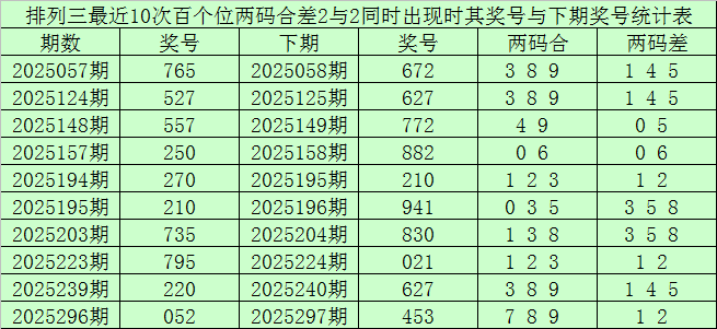 百个位合差分析:上期奖号百个位开出57组合,两码合为2,两码差为2,最近10次百个位两码合2与两码差2同时出现时,其奖号和下期奖号分别为: