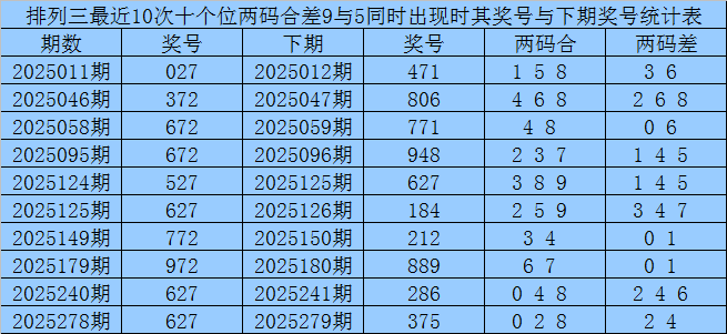 从以上统计可以看出,十个位两码合差9与5同时出现之后其下期两码合差表现最热的4个分别为:1248,本期十个位两码合差可以参考这四码中的数据。