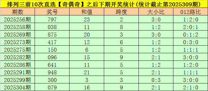 开奖回顾:排列三第2025309期开出奖号:527,类型为组六,和值为14,奇偶比为2:1,大小比为2:1,跨度为5。