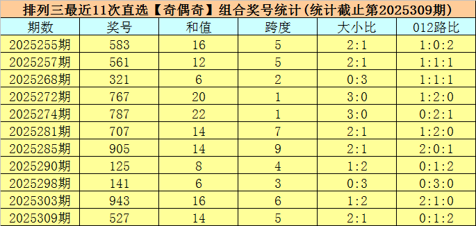 排列三上期奖号为527,开出奇偶类型为【奇偶奇】,前10次【奇偶奇】类型奖号分别开出:583、561、321、767、787、707、905、125、141、943;