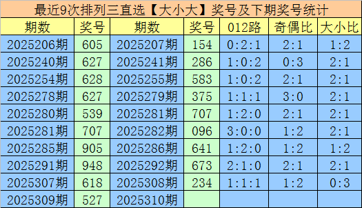 上期回顾:排列三第2025309期奖号为527,组六,大小比开出2:1,直选分布为:大小大。