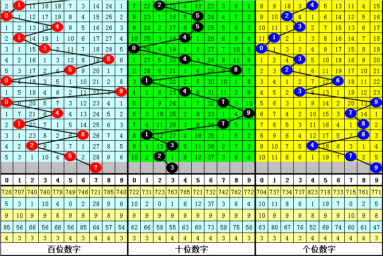 3.在以上9期奖号中,号码012路比分别开出0:2:1、1:0:2、1:0:2、1:1:1、1:2:0、3:0:0、1:2:0、2:1:0、1:1:1,012路出现个数比为11:9:7,本期预计开出012路比2:1:0。