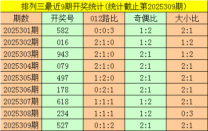 二、体彩排列三前9期奖号开出:582-016-943-079-497-178-618-234-527,其中奖号大小比为14:13,012路比为9:10:8,奇偶比为14:13;