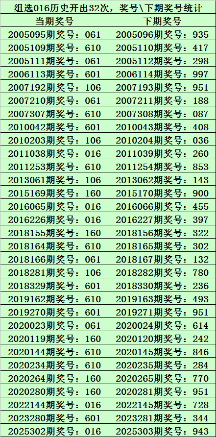 上期回顾:排列三第2025310期奖号为:016,类型:组六,历史上直选号码016出现了6次,组选号码016出现了32次。