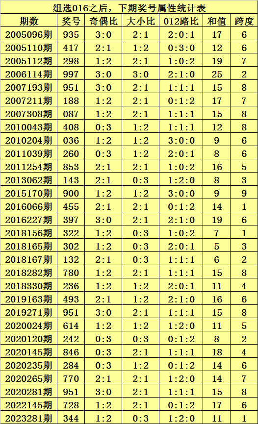 一、直选016分析:排列三最近3期分别开出直选号码:234历史出现次数为10次、527历史出现次数为8次、016历史出现次数为6次,本期注意历史上已开出8次左右的直选号码。