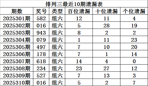 上期回顾:排列三第2025310期奖号:016,组六,直选遗漏总值为14期。