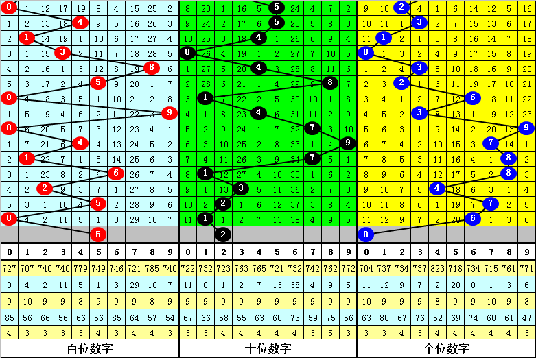 百位:上期开出0,近10期012路比为5:2:3,其中0路号遗漏2期再出,本期放弃0路号,关注2路号,看好5。