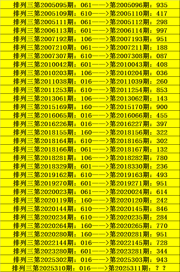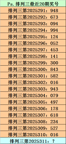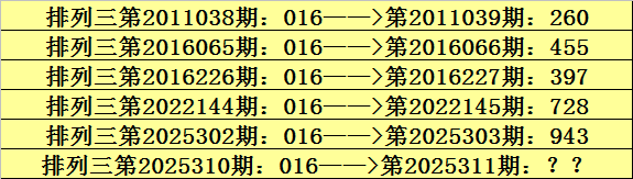 第2025310期排列三奖号为016,历史上该号码直选出现6次,下期奖号分别为:260、455、397、728、943。