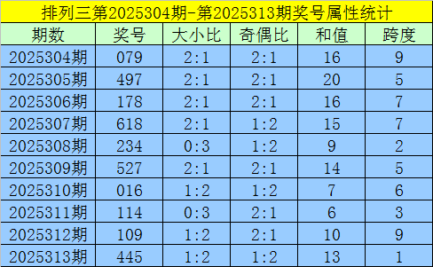 上期回顾:排列三第2025313期出现奖号445。开出组三,奇偶比1:2,012路比0:2:1,大小比1:2,和值13,跨度1。
