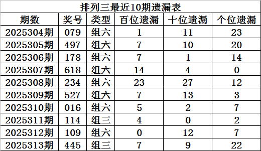 上期回顾:排列三第2025313期奖号:445,组三,直选遗漏总值为38期。