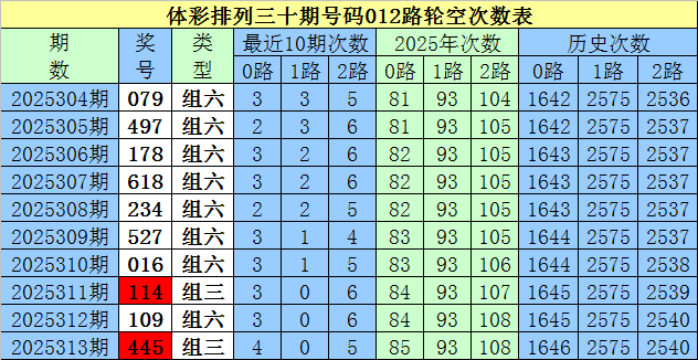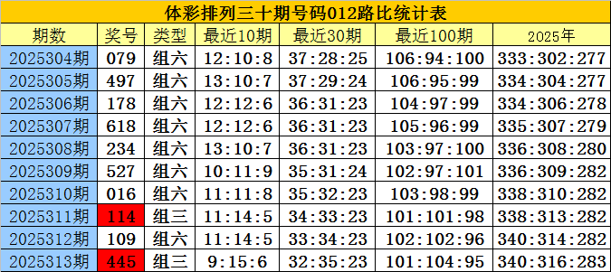 开奖回顾:排列三第2025313期奖号为:445,号码012路比为0:2:1。