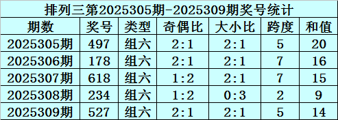 组选类型判断:最近5期排列三开出3次组六号码,本期重点关注组六号码出现。