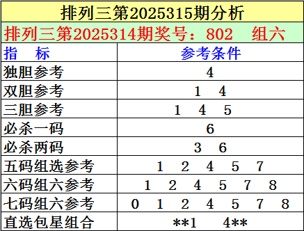 1.排列三最近十期分别开出号码:497-178-618-234-527-016-114-109-445-802,其中有6期奖号开出了上期的重复号码,本期防重号轮空,排除第2025314期奖号:802中的号码,关注号码:4。