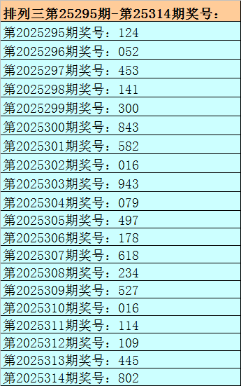 开奖回顾:排列三第2025314期开出奖号:802。其中奖号大小比为1:2,奇偶比为0:3,012路比为1:0:2,和值为10,跨度为8。
