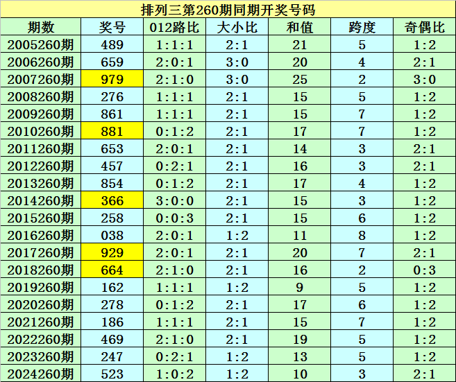 本期为排列三第2025260期开奖,开奖日期为:2025年9月27日,历史上排列三第260期已开出了20次奖号,历年同期开出号码分别为:489-659-979-276-861-881-653-457-854-366-258-038-929-664-162-278-186-469-247-523。