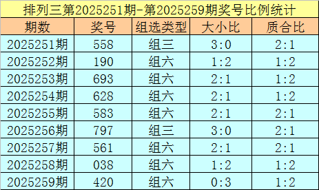 上期回顾:排列三第2025259奖号开出420,奖号质合比为1:2,大小比为0:3,跨度为4,类型为组六。