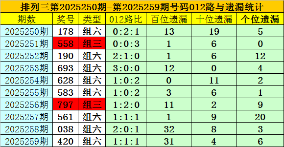 开奖回顾:排列三第2025259期奖号为:420,类型为组六,号码012路比为1:1:1,百十个位号码直选分别遗漏31期、4期和6期。