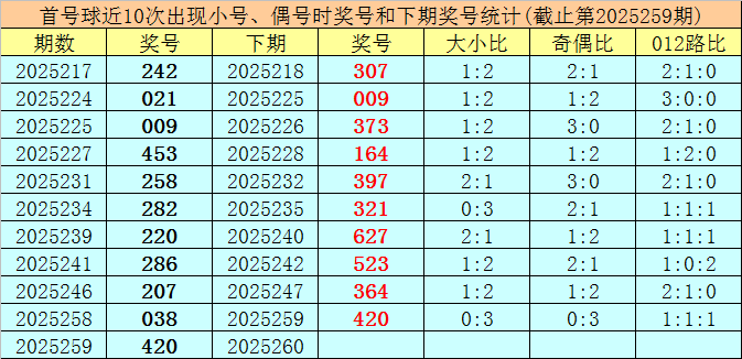 在首号球前10次开出小 号、偶号类型之后,其下期分别开出奖号:307、009、373、164、397、321、627、523、364、420,其中号码奇偶比为7:3,大小比为2:8,012路比为7:2:1。