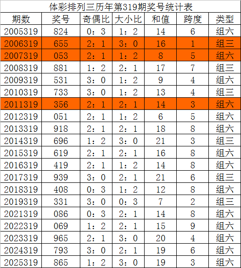 在历年排列三第320期开奖中:组三号码出现6次,组六号码出现13次。组六号码出现比例略高,本期奖号形态参考:组六号码。