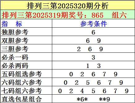 1.排列三最近十期分别开出号码:016-114-109-445-802-973-918-756-438-865,其中有4期奖号开出了上期的重复号码,本期预计第2025319期奖号:865中有重号,参考号码:6。