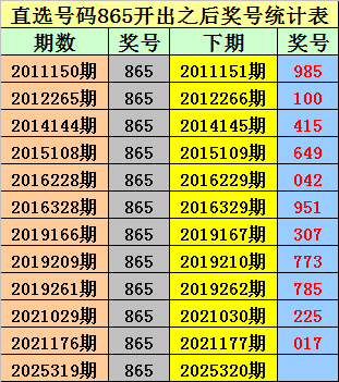 排列三直选865出现之后下期奖号分别为:985-100-415-649-042-951-307-773-785-225-017。