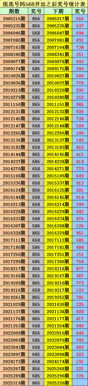 排列三组选568出现之后下期分别开出:555、537、694、491、738、351、493、200、500、778、295、152、985、626、728、524、100、102、452、415、419、770、649、913、201、014、709、042、976、126、951、686、484、151、754、877、307、773、123、785、225、928、017、949、648、702、082、223、191、321、125。