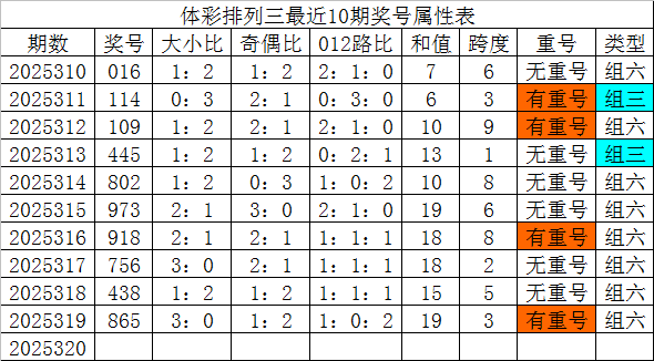 体彩排列三第2025320期发哥观点: