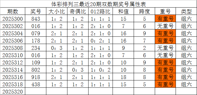 体彩排列三最近20期双数期奖号分别为:843、016、079、178、234、016、109、802、918、438,各期奖号详细属性下表: