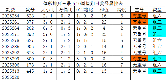体彩排列三最近10周星期日奖号分别为:628、877、202、898、627、905、673、300、178、445,各奖号属性详见下表: