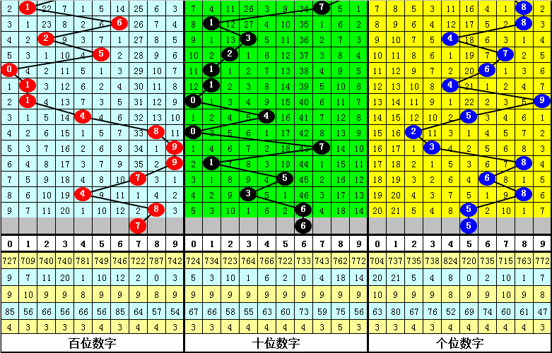 其中,号码0-9开出次数分别为:号码0开出3次、1开出5次、2开出1次、3开出2次、4开出4次、5开出3次、6开出3次、7开出2次、8开出4次、9开出3次。