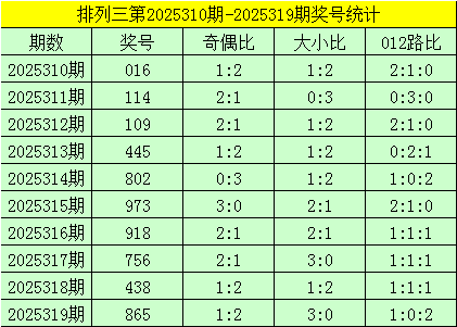 开奖回顾:排列三第2025319期奖号为:865,其奇偶比为1:2,大小比为3:0,奖号012路比为1:0:2。