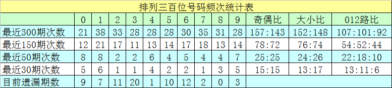 百位号码:前50期走势活跃的号码为:0、1开出8个,9开出7个;走势最冷的号码为:2、3开出2个,5、7、8开出4个。奖号012路比开出22:18:10,奇偶比开出25:25。本期百位杀排除:0、3,注意号码2、6、8,胆码参考8。