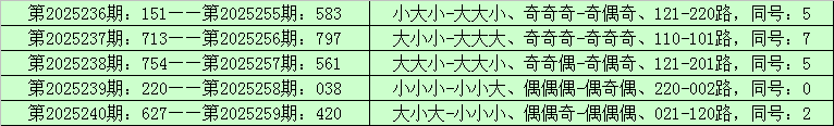 统计排列三已开出的奖号发现,在连续5期(第2025236期-第2025240)奖号为:151-713-754-220-627。