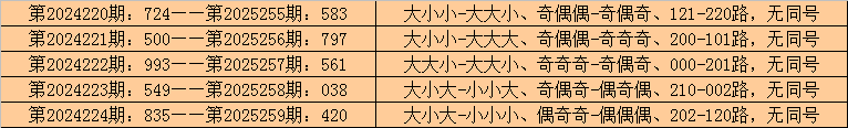 排列三第2025255期-第2025259期连续5期奖号为:583-797-561-038-420。