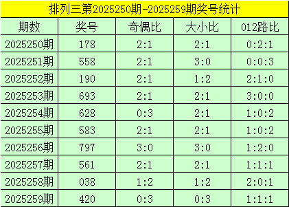 开奖回顾:排列三第2025259期奖号为:420,其奇偶比为0:3,大小比为0:3,奖号012路比为1:1:1。