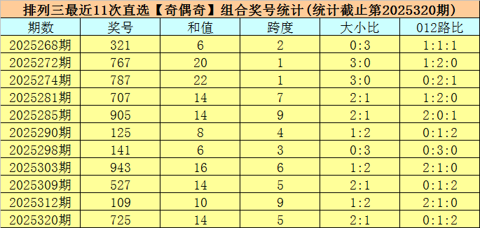 开奖回顾:排列三第2025320期开出奖号:725,类型为组六,和值为14,奇偶比为2:1,大小比为2:1,跨度为5。