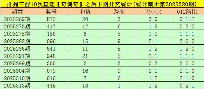 排列三上期奖号为725,开出奇偶类型为【奇偶奇】,前10次【奇偶奇】类型奖号分别开出:321、767、787、707、905、125、141、943、527、109;