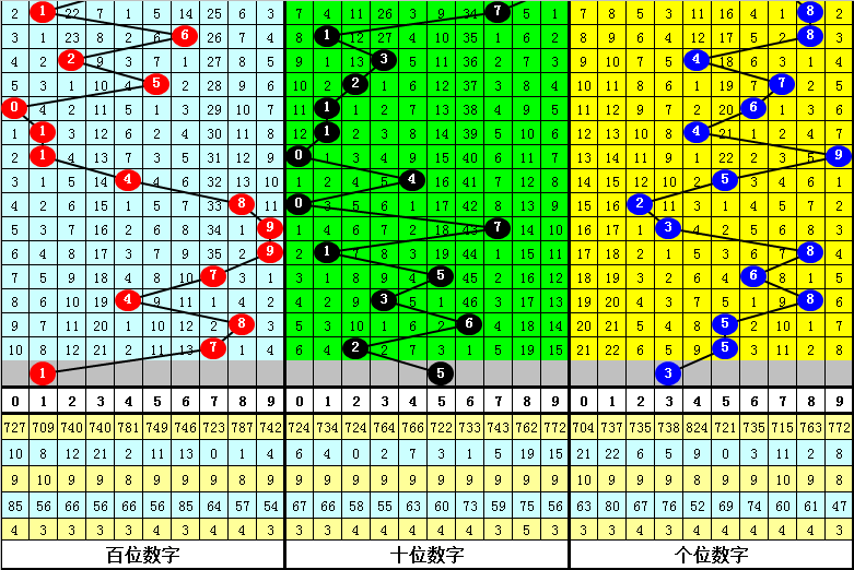 百位分析:该位上期奖号为7,出现1路、奇数、大号,在前11期奖号,该位012路比为3:6:2,2路号码较少,目前012路号码遗漏期数分别为4、0和1,近期百位注意1路号码走热。