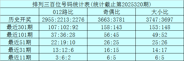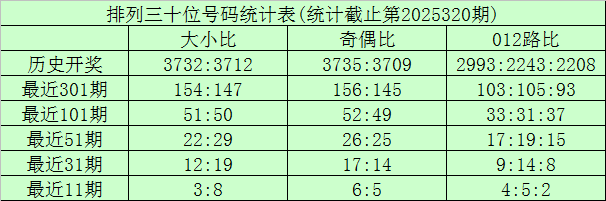 上期回顾:排列三第2025320期奖号为:725。奖号形态组六,大小比2:1,奇偶比2:1,012路0:1:2。