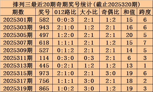 上期回顾:排列三2025320期奖号为725,奇偶比为2:1,大小比为2:1,跨度为14。