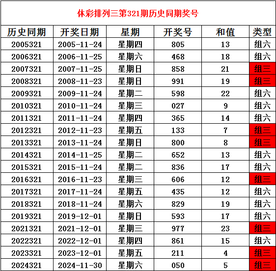 2025年12月1日排列三第321期开奖,历史同期分别开出奖号:
