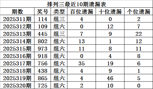 上期回顾:排列三第2025320期奖号:725,组六,直选遗漏总值为12期。